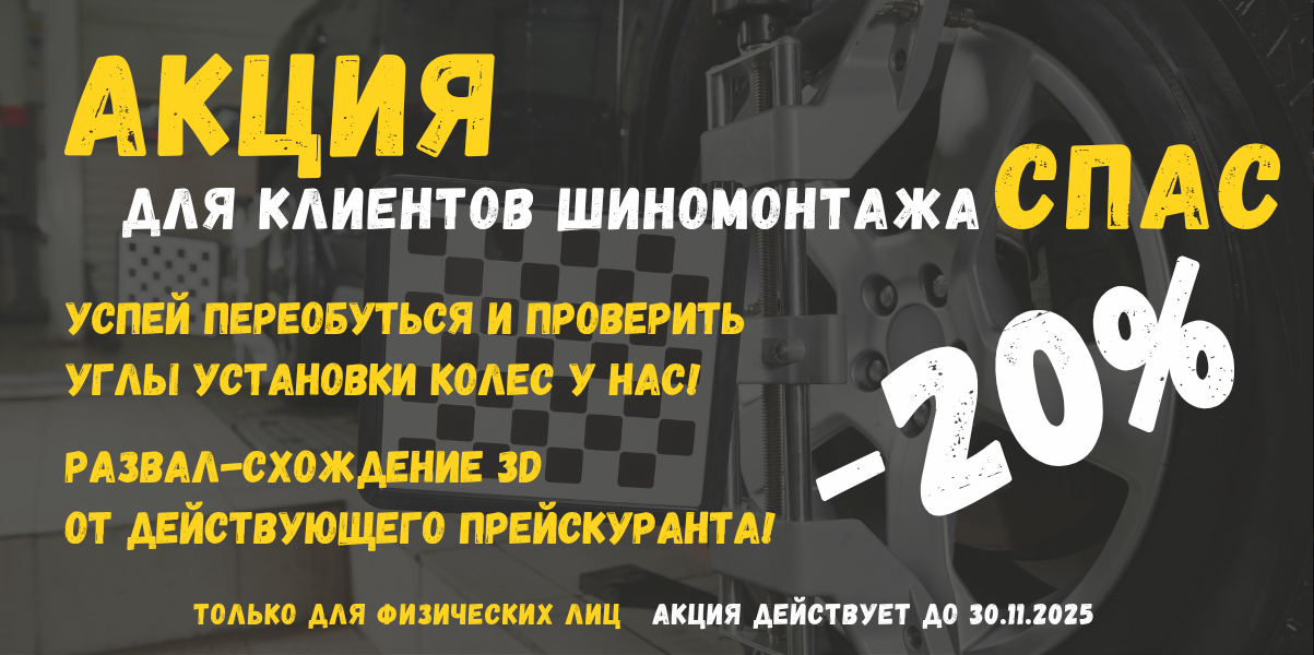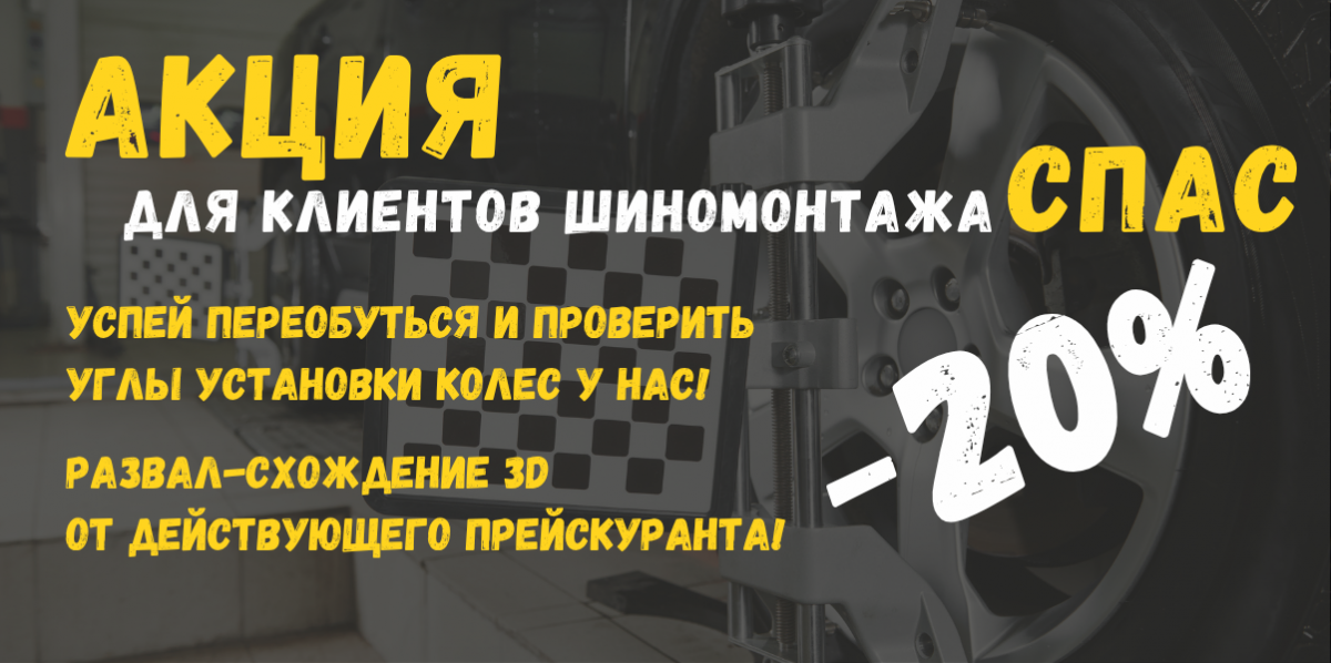 Для наших клиентов шиномонтажа СПАС - физических лиц на развал-схождение 3D -20% от действующего прейскуранта! Успей переобуться и проверить углы установки колес!